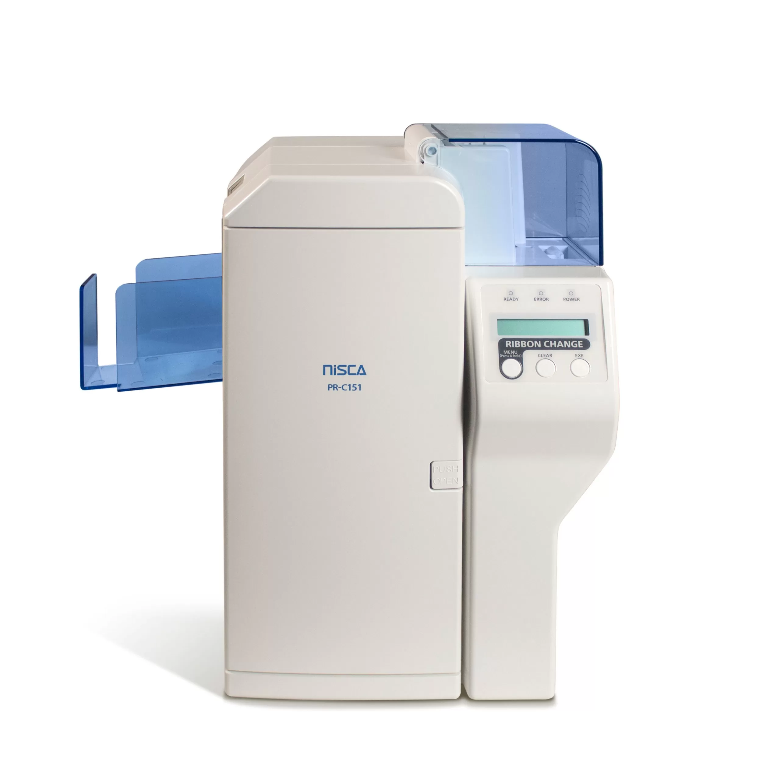 sencillos La operación de su impresora de tarjetas PR-C151 es simple con el panel de visualización intuitivo de dos líneas LCD de Nisca, que proporciona actualizaciones de estado y avisos de diagnóstico fáciles de leer. El PR-C151 también ofrece una serie de características para el mantenimiento facilitado, como la limpieza automática, un cassette de cinta de carga fácil y un módulo de cabezal de impresión autoalineable.